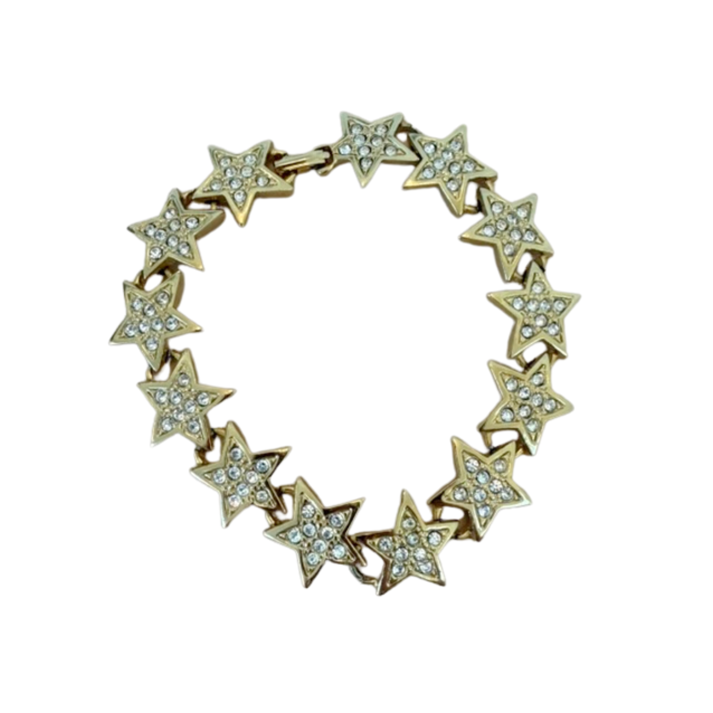 Celestial glamour from the Mod era. This gold-tone bracelet features linked star motifs glittering with rhinestones — radiant, playful, and ready to steal the spotlight.
