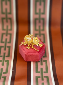 Celebrate the sweetness of nurture and nature with this charming 1991 AVON collectible lapel pin. Crafted in a polished gold-tone finish, this petite treasure features a graceful mama bird perched protectively beside her nest, which is filled with delicate simulated pearl “eggs.” The soft pearl accents add a lovely contrast to the warm metallic shine, creating a piece that feels both whimsical and elegant.