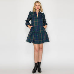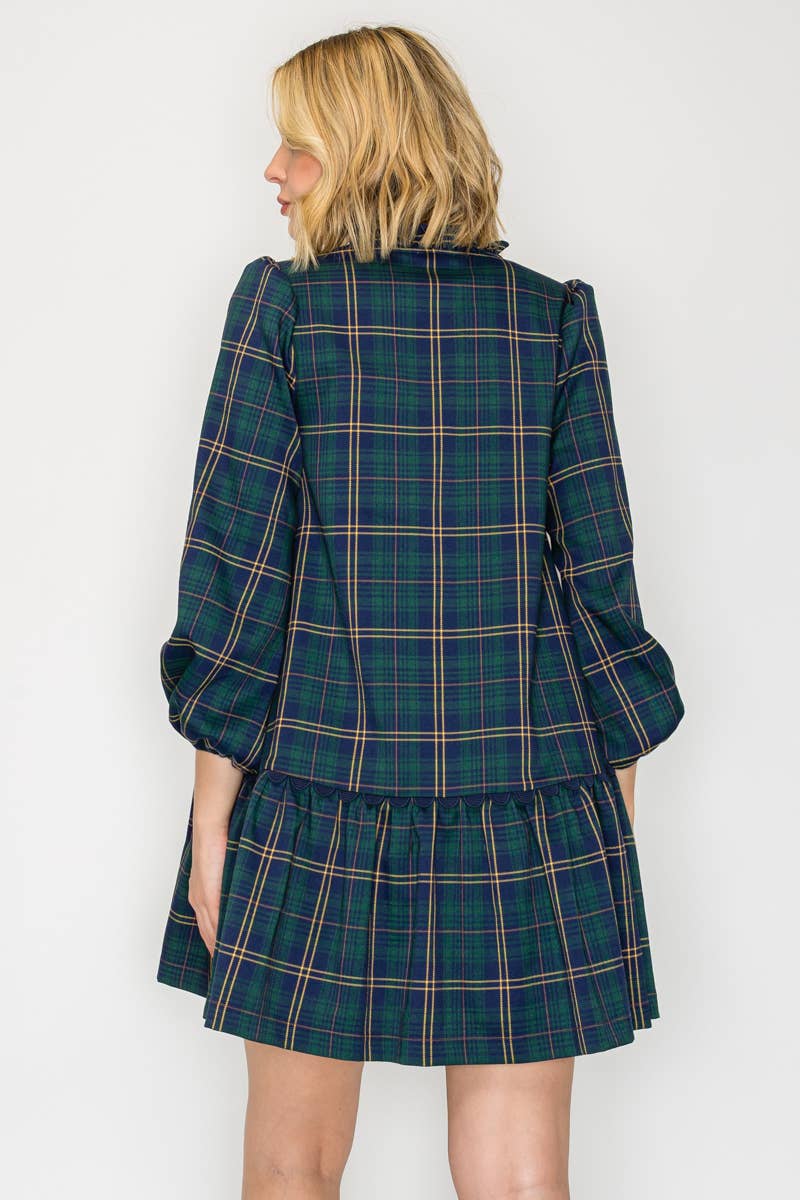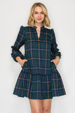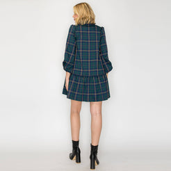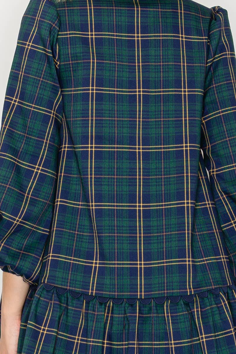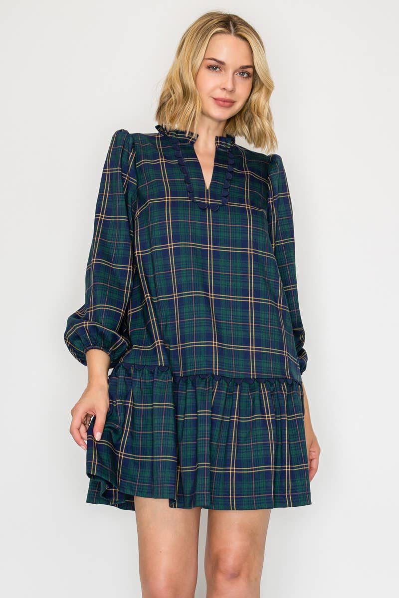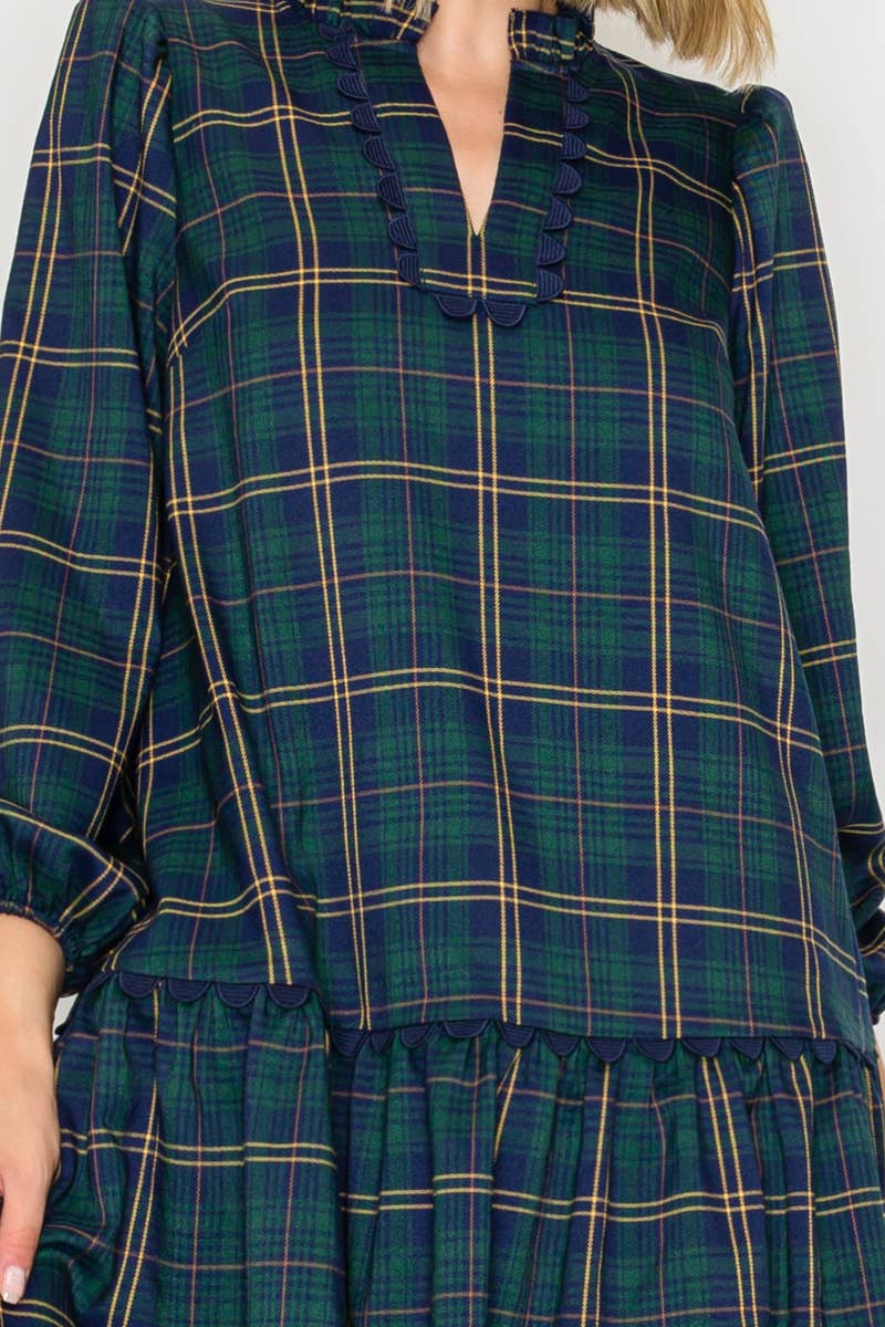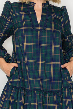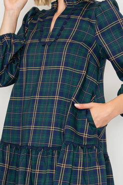 A modern take on a timeless classic, this tartan check dress is perfect for fall gatherings and everyday wear. The ruffle-trim neckline and lace details add a touch of femininity, while the elastic ¾ sleeves and side pockets keep it effortlessly practical.