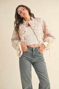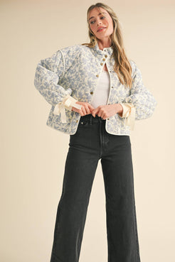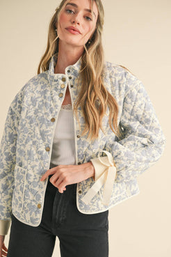 Be the trendsetter that you are in this floral quilted jacket! Quilted puffer shapes this chic jacket that features delicate and lovely floral print throughout and has a stand collar, a button down closure, and drop shoulder long balloon sleeves. A gorgeous ribbon detail ties at the cuffs for an extra romantic look. Contrast binding lines the edges and pockets of this jacket.