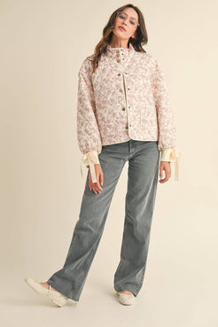 + Floral quilted jacket with ribbon detail + Stand collar + Snap button closure + Contrast binding trim + Drop shoulder long balloon sleeves + Tying ribbon detail on cuffs + Patch pockets + Lined + Model is 5' 10.5” 32-24-36 and wears a S