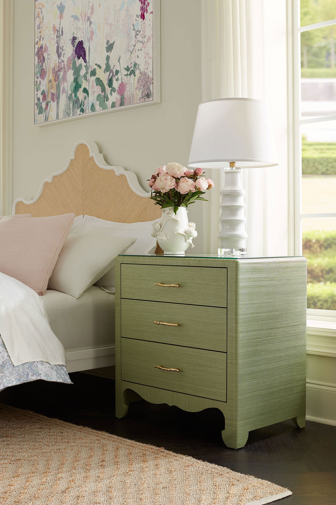 The Gianna Collection exudes feminine charm and delicate beauty. Each piece is meticulously wrapped in grasscloth and finished with a clear lacquer, highlighting the natural texture while providing a subtle sheen. Graceful detailing adorns the trim and feet, adding a touch of artistry that enhances the collection's refined aesthetic. This harmonious blend of materials and design elements creates a timeless appeal, making the Gianna Collection a perfect addition to spaces seeking a soft, sophisticated ambiance.