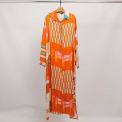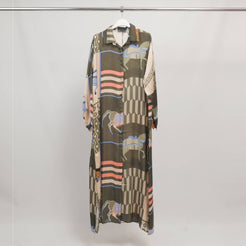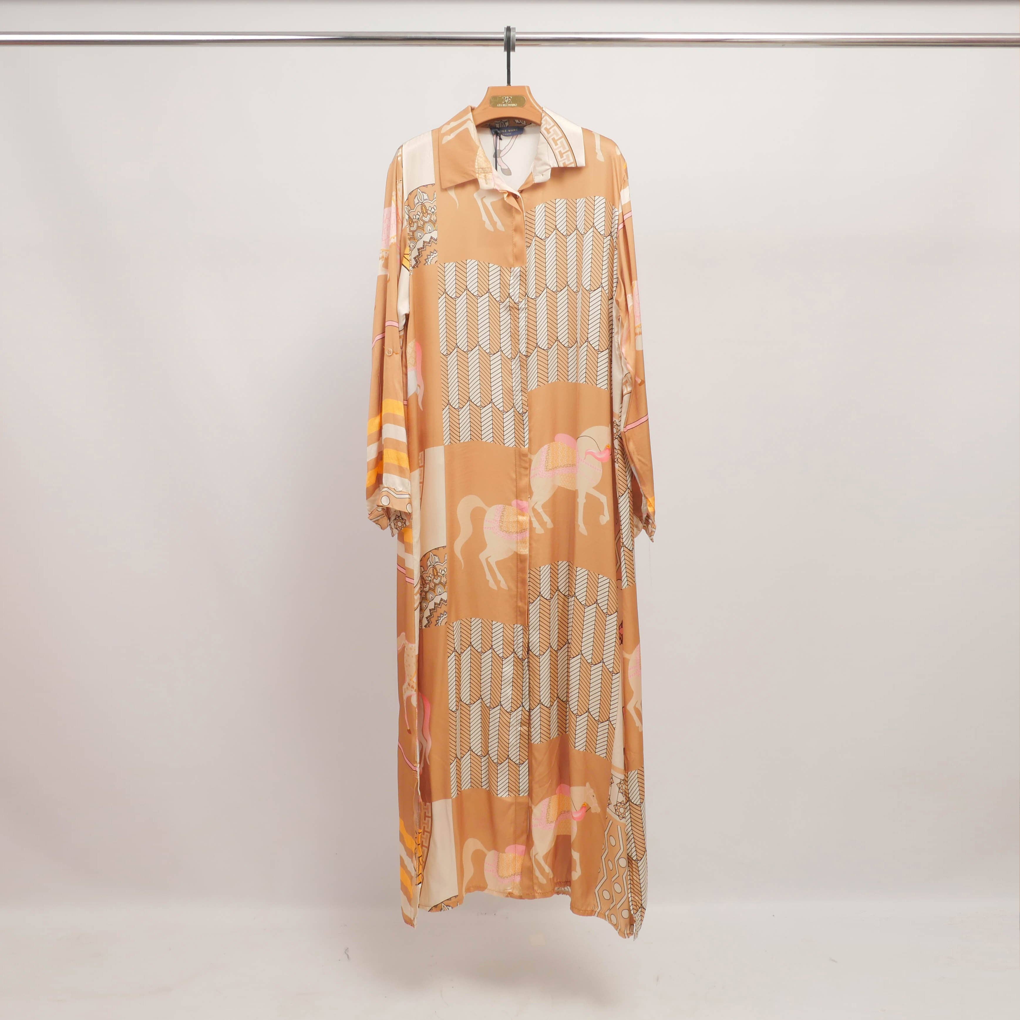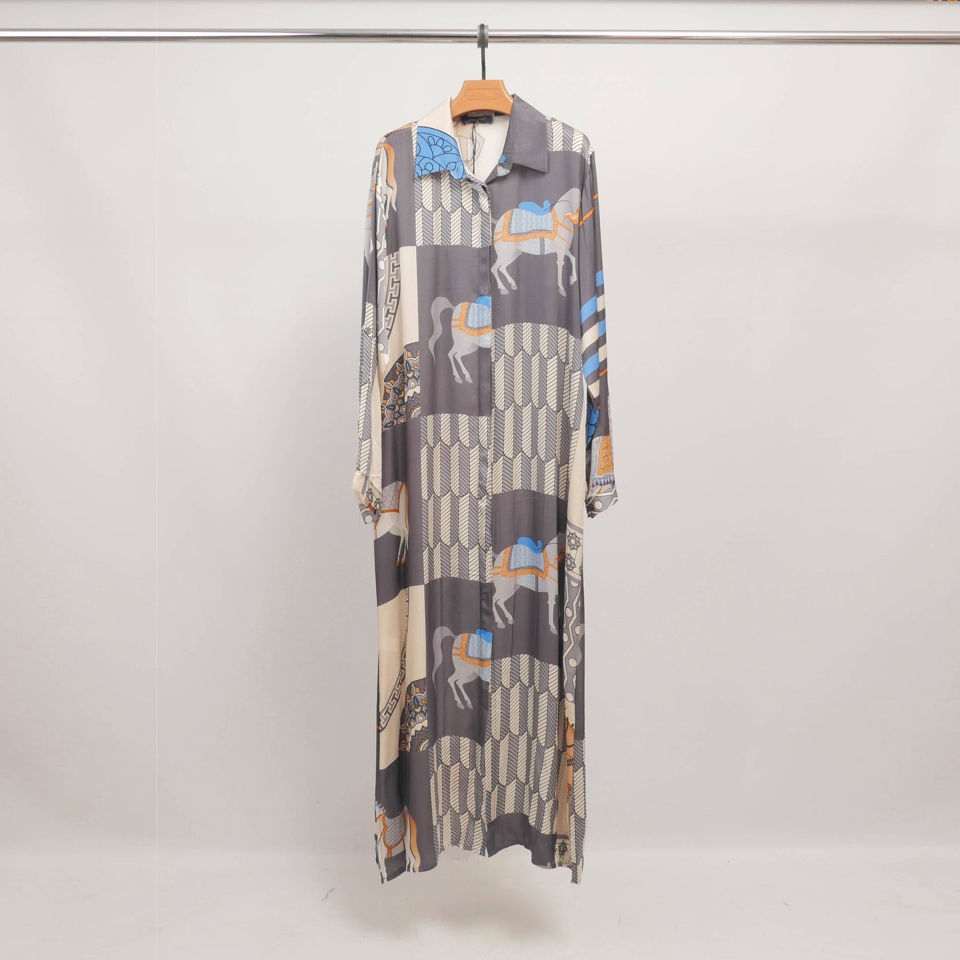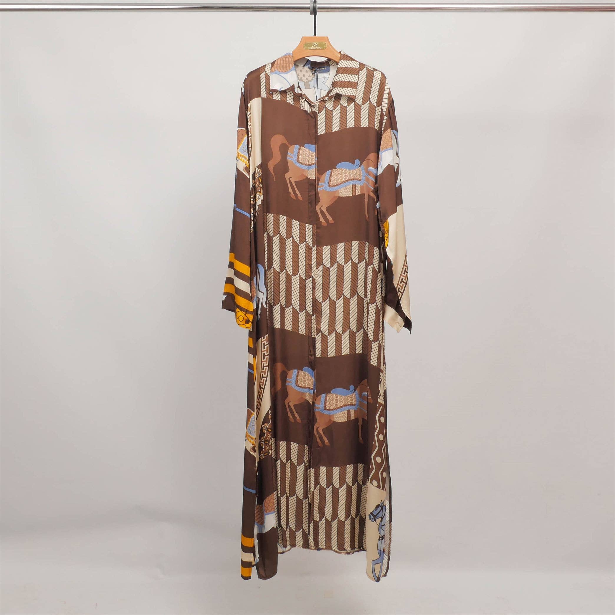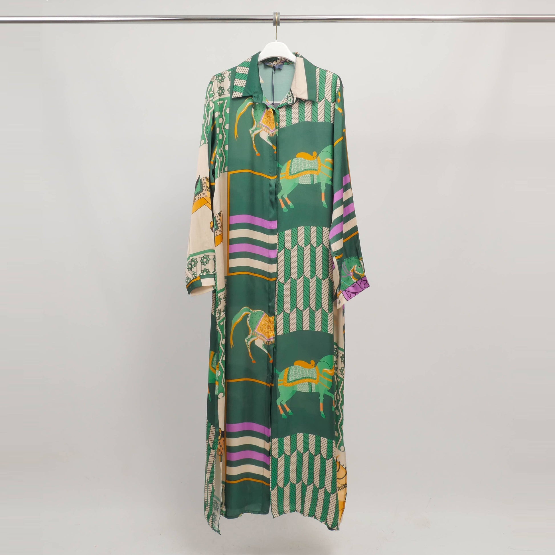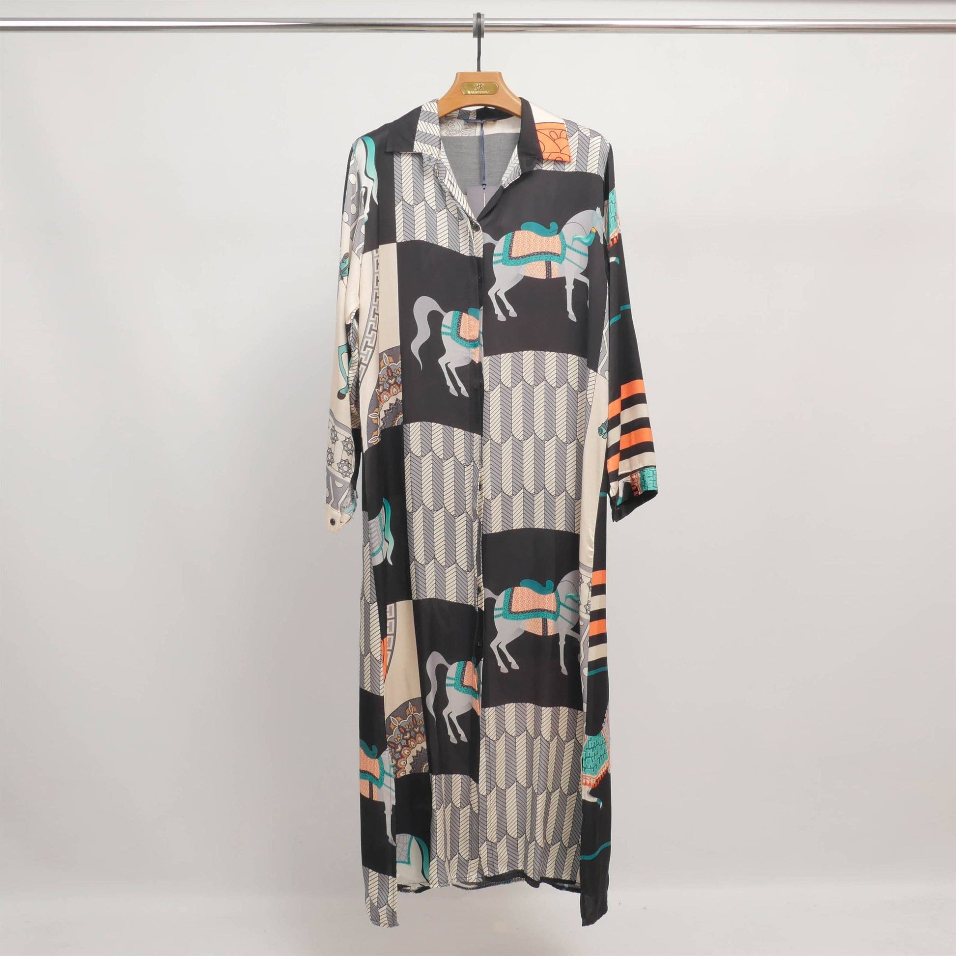 A fluid and radiant piece that embodies casual elegance. This long dress with a horse print combines graphic refinement and bohemian flair, with its contrasting color blocks and revisited oriental details. It features a loose straight cut, long sleeves, and a shirt collar for a sleek and comfortable silhouette. Its airy and slightly satin material provides a soft drape, ideal for sunny days. Wear it belted for a more structured look or flowing for a free and confident style.