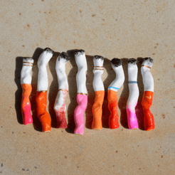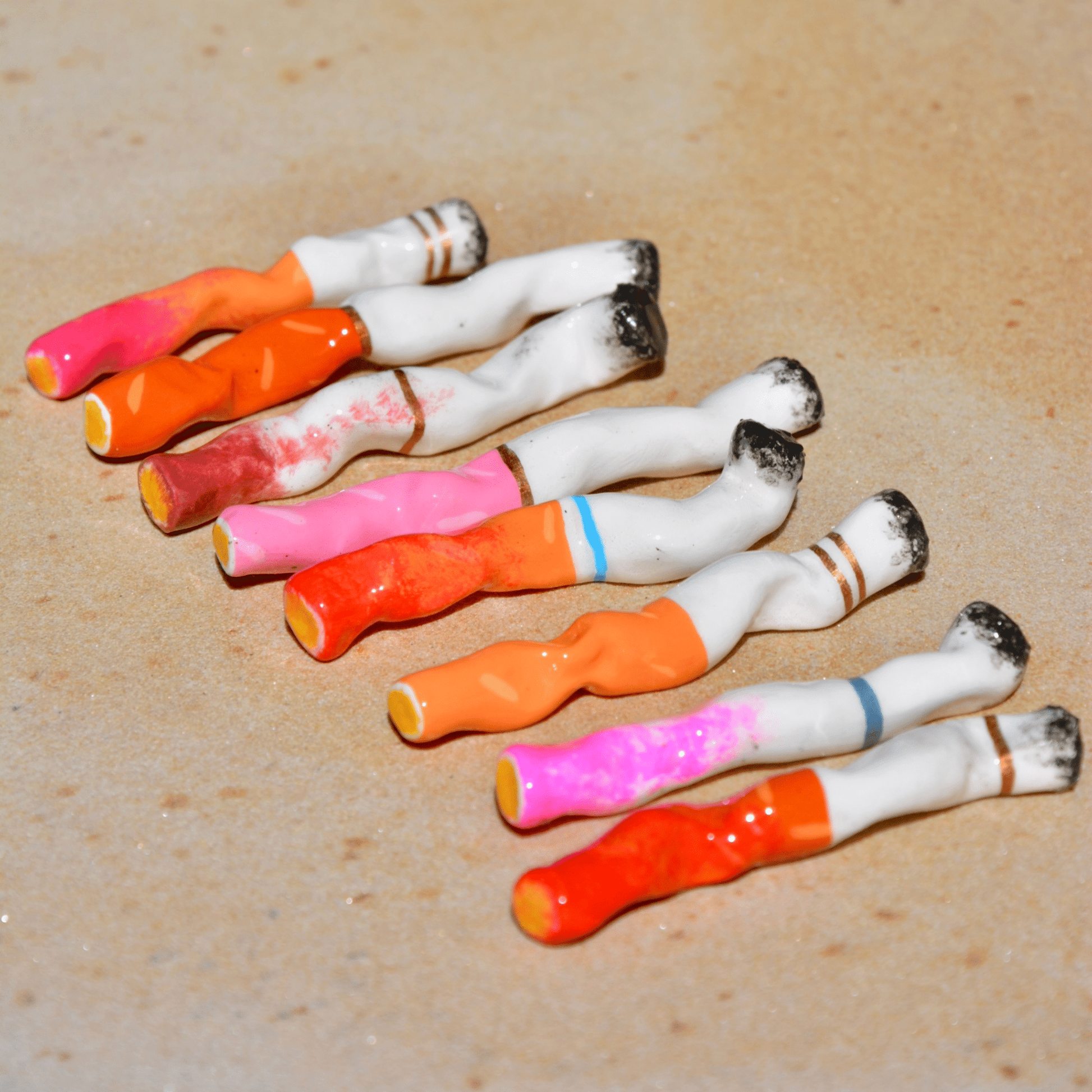 The Vanity Cigarette collection features sculptural “long” smokes in pink, white, and classic tones, with select pieces kissed by varying shades of lipstick at the tip. Equal parts playful and provocative, they’re a commentary on indulgence, ritual, and the art of presentation.