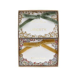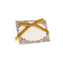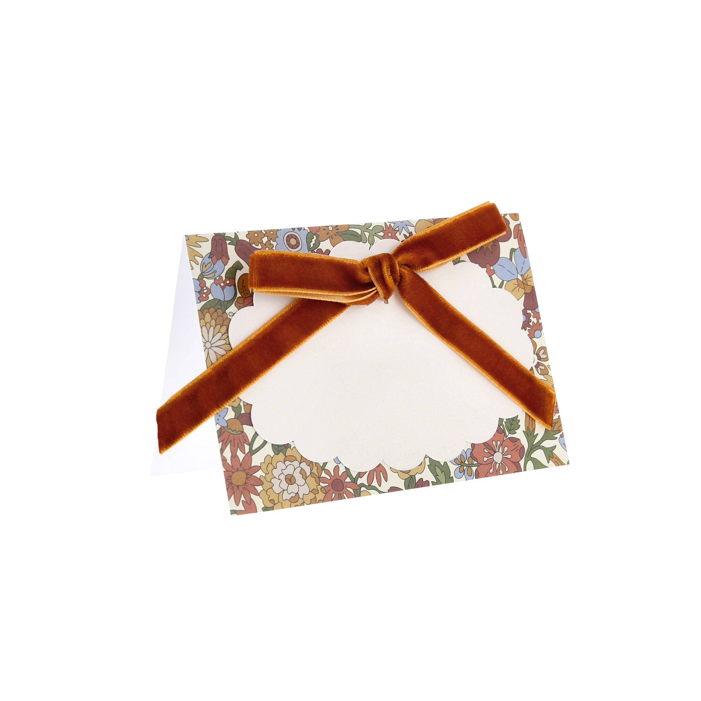 * 6 paper place cards featuring 6 different Liberty floral prints in warm fall colors * Each is decorated with a luxurious velvet bow in burnt orange, muted gold, teal, sage, berry red or dusty pink * Pale matte gold foil details * Each place card comes with a scalloped paper tag for you to write the name on * This set comes with 12 extra tags, so you can reuse the place cards time and time again * Pack of 6 in 6 colors * Product dimensions: 4.25 x 3 x 0.25 inches