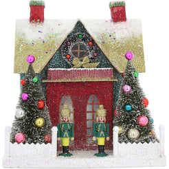 Create a festive focal point in your holiday décor with this Merry & Bright Glitter Chalet. Featuring a classic red-and-green color palette and coated in sparkling glitter, this cheerful winter chalet brings warmth, nostalgia, and vibrant holiday spirit to any display. Intricate cut-out windows, snowy accents, and charming architectural details make it a standout piece for mantles, shelves, or festive village scenes.