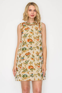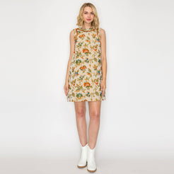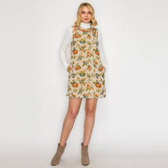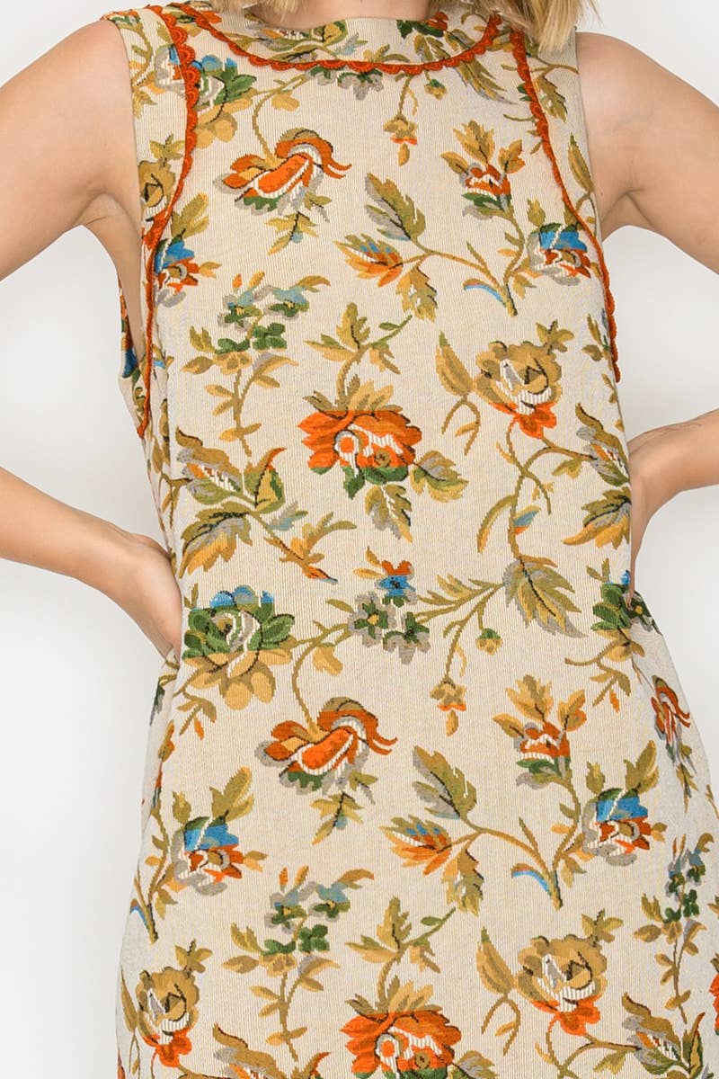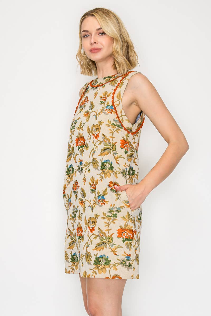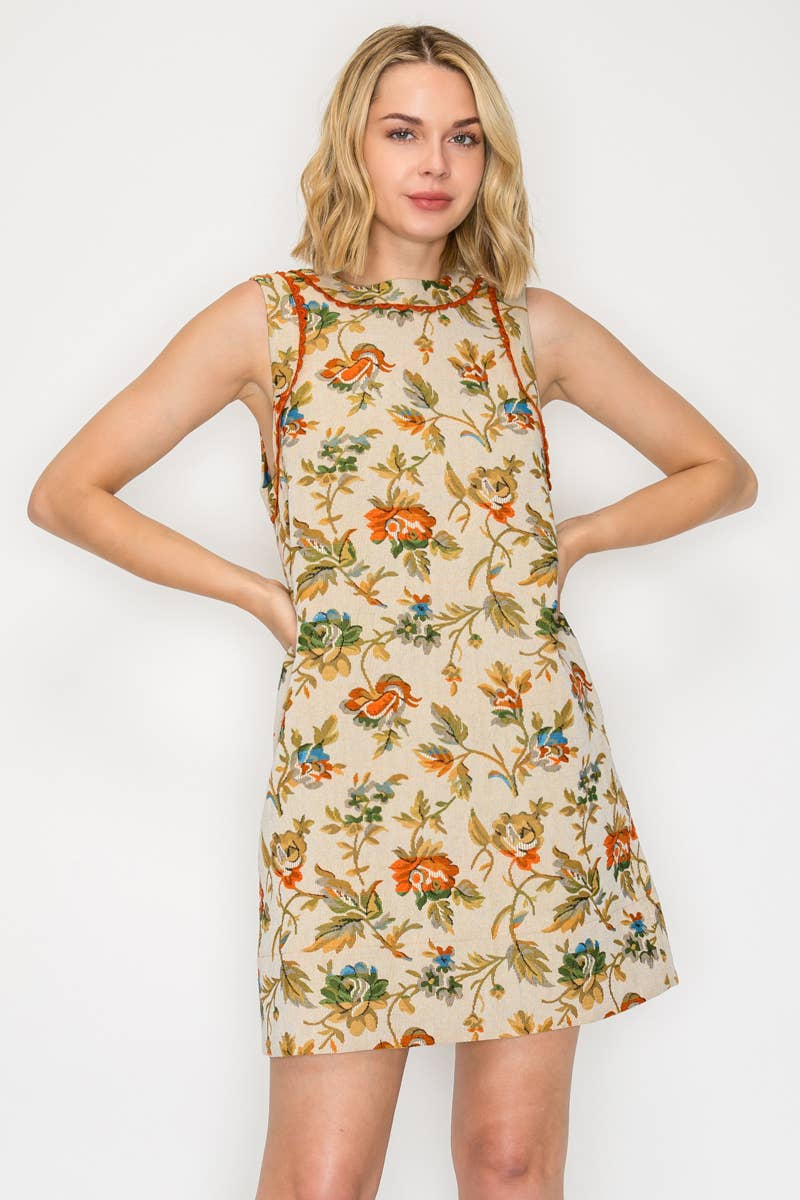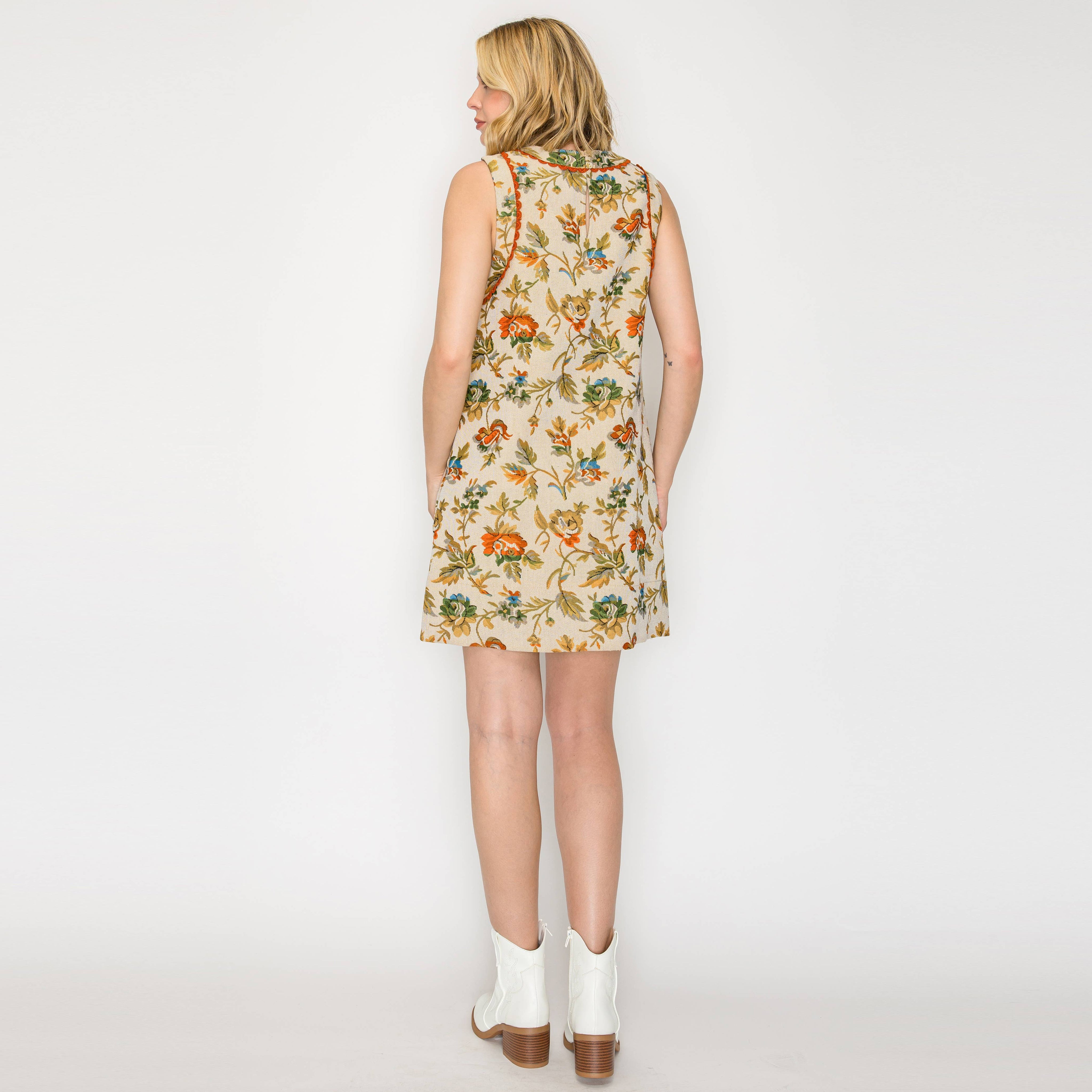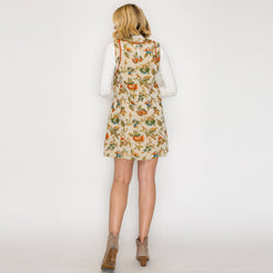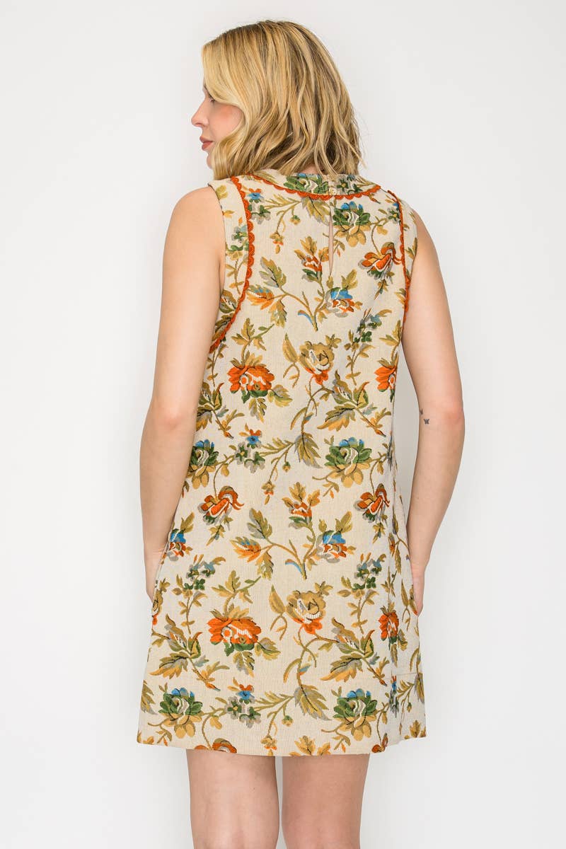 A versatile piece designed for year-round wear, this floral and leaf tapestry dress blends timeless pattern with modern ease. Finished with rust-colored lace trim at the neckline and armholes, side pockets, and a back keyhole with button closure, it’s as practical as it is chic. Style it solo in warmer months or layer over a turtleneck sweater for a cozy fall/winter look.