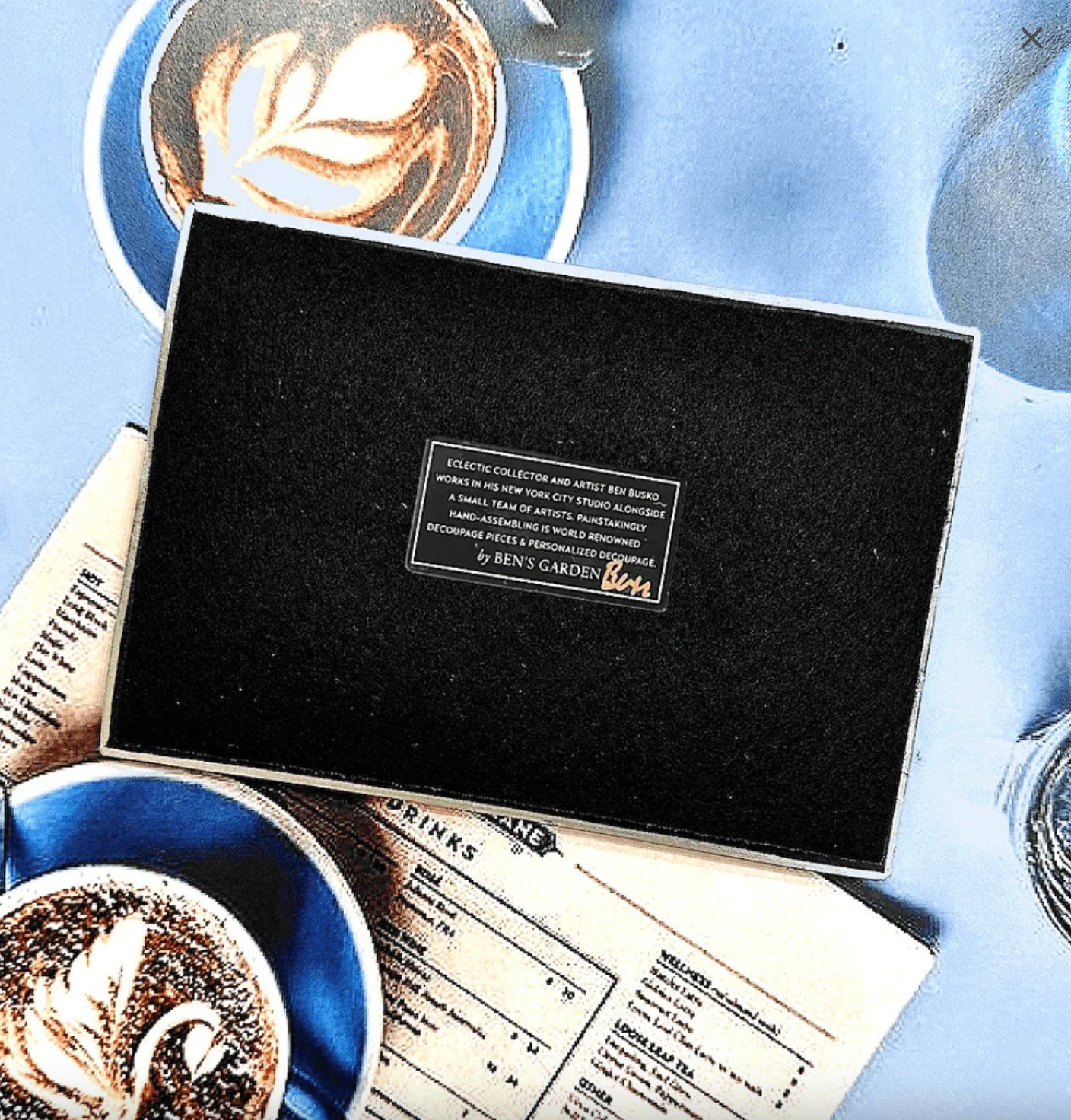 In the French tradition of Decoupage, this bent-glass tray was handcrafted in our New York Studio. This illustration reflects Ben's unique aesthetic for the charming and unusual. Each is individually signed by Ben. Both practical and charming, Ben's signature glass decoupage is food safe, wipe clean and the back side is felted. It is also suitable for hanging with a plate hanger and is attractive standing on a gallery easel. A folded card explaining the time-honored decoupage process accompanies each piece.