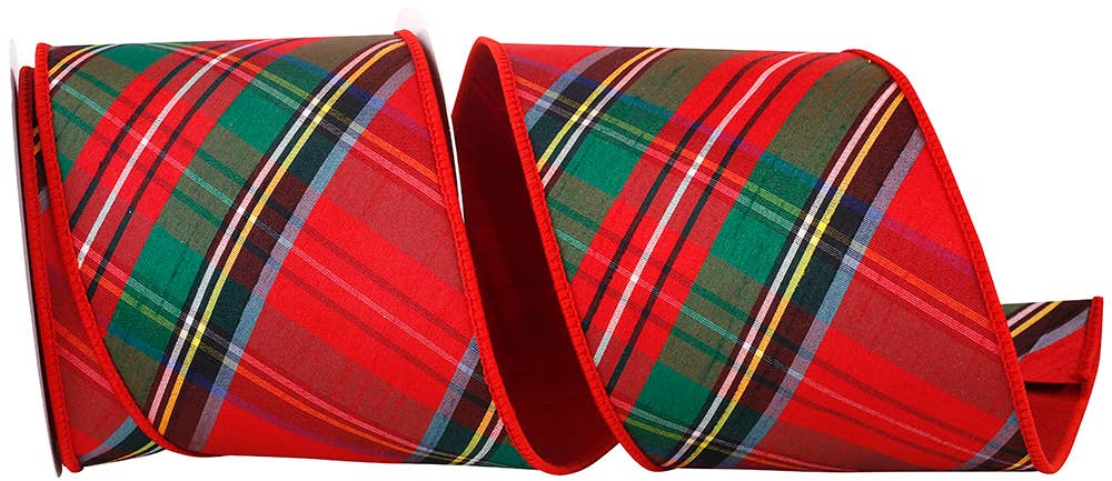 Ribbon , Red, 4 Inch, 5 Yards - A classic red and green diagonal plaid design is woven in to a luxurious dupioni. The elegant look is completed with a solid red backing and a coordinating red wired edge.