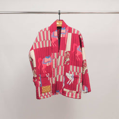This quilted kimono-style jacket reinvents graphic elegance with a striking patchwork print of stylized horses and geometric patterns. Its loose fit with long sleeves and shawl collar gives it a relaxed and contemporary look, ideal for layering. Featuring two patch pockets and a flexible structure, it combines comfort and originality. Made from a soft, slightly padded fabric, it provides light warmth and a bold style. Wear it open over a monochrome outfit for a daring look or belted to structure the silhouette.