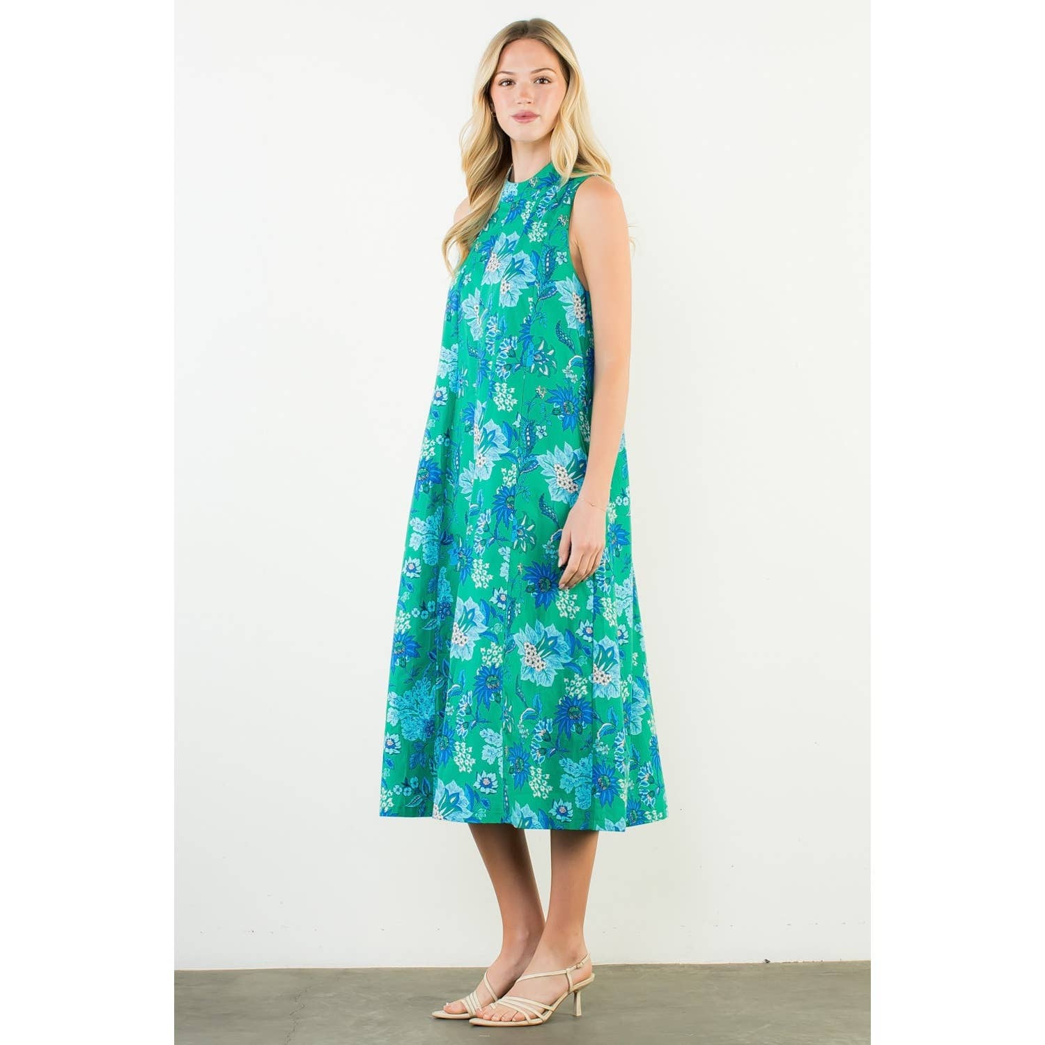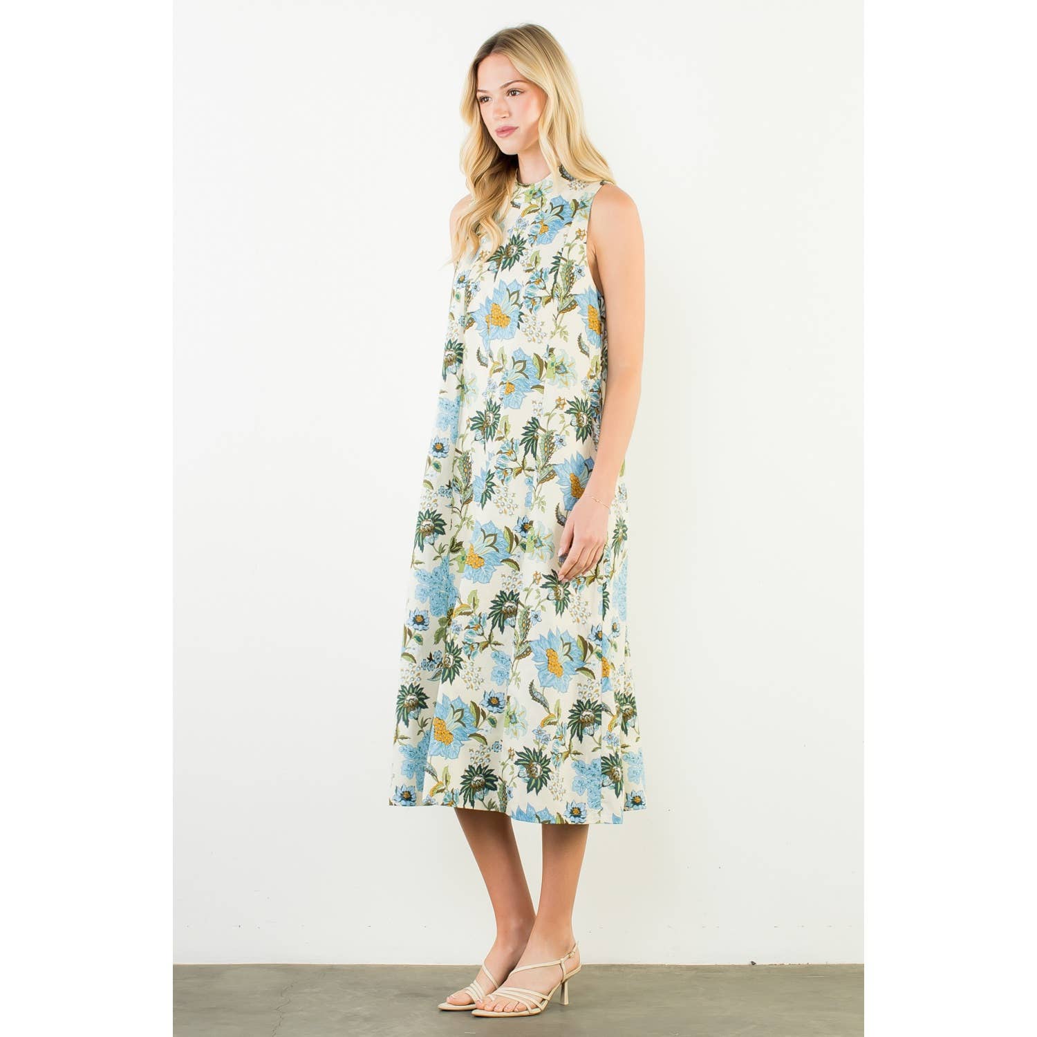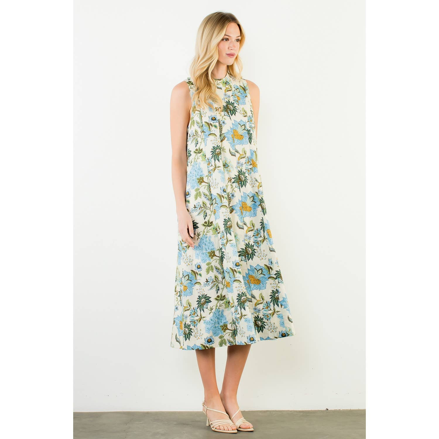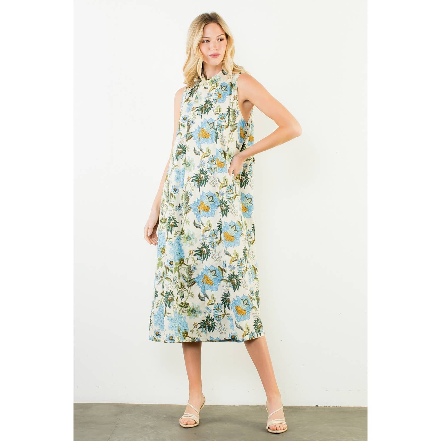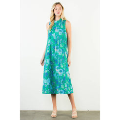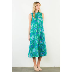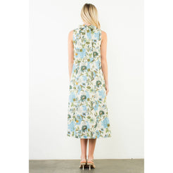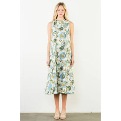 This sleeveless midi features a graceful high neckline and an easy, elongated silhouette that moves beautifully with every step. The blue and beige botanical print feels fresh yet classic — equally at home at a spring luncheon, a garden party, or an early fall gathering layered with a light wrap.