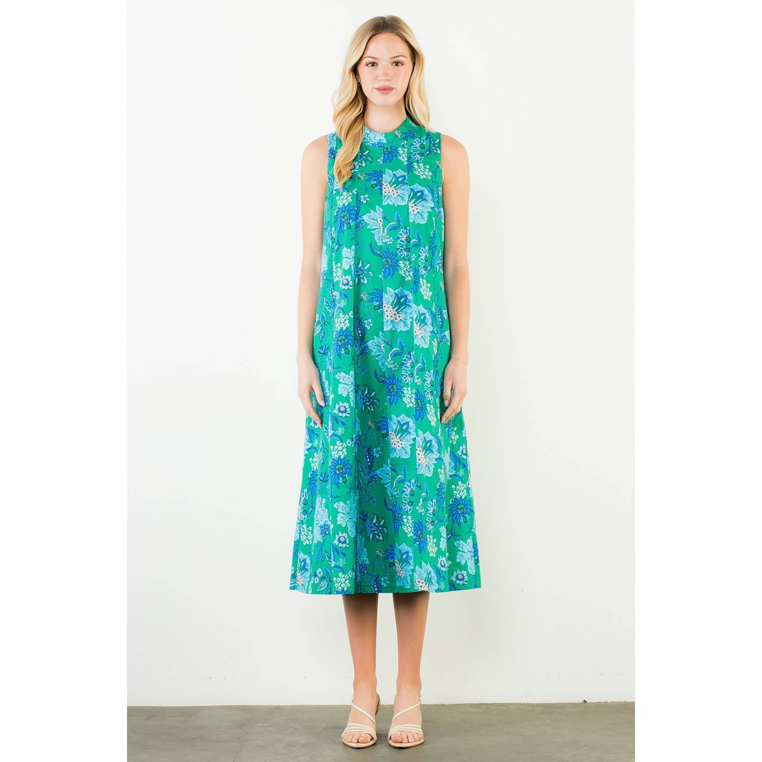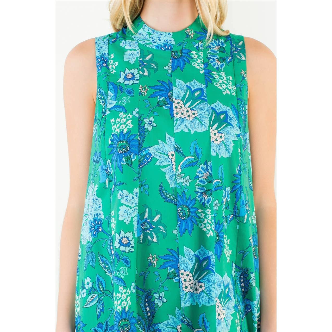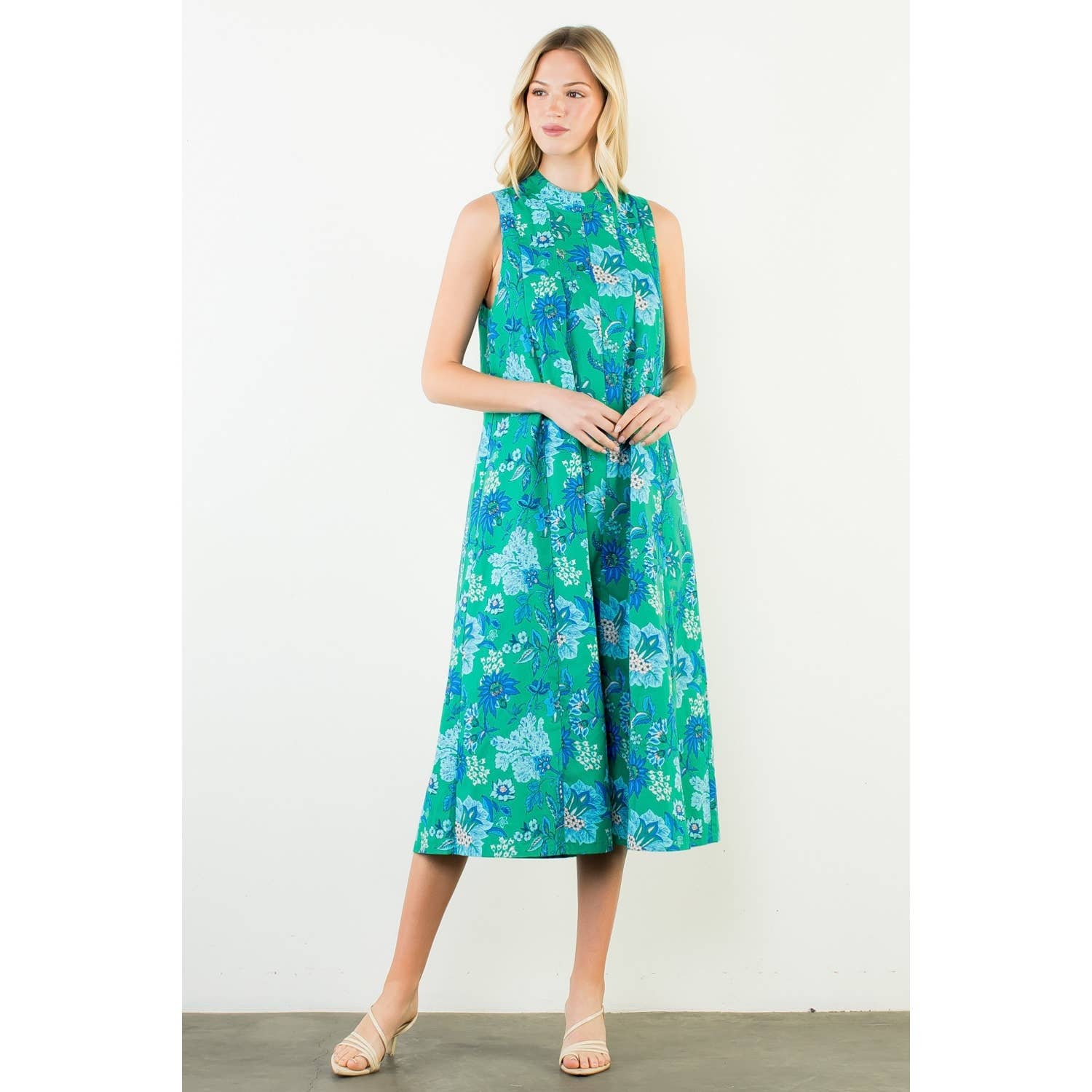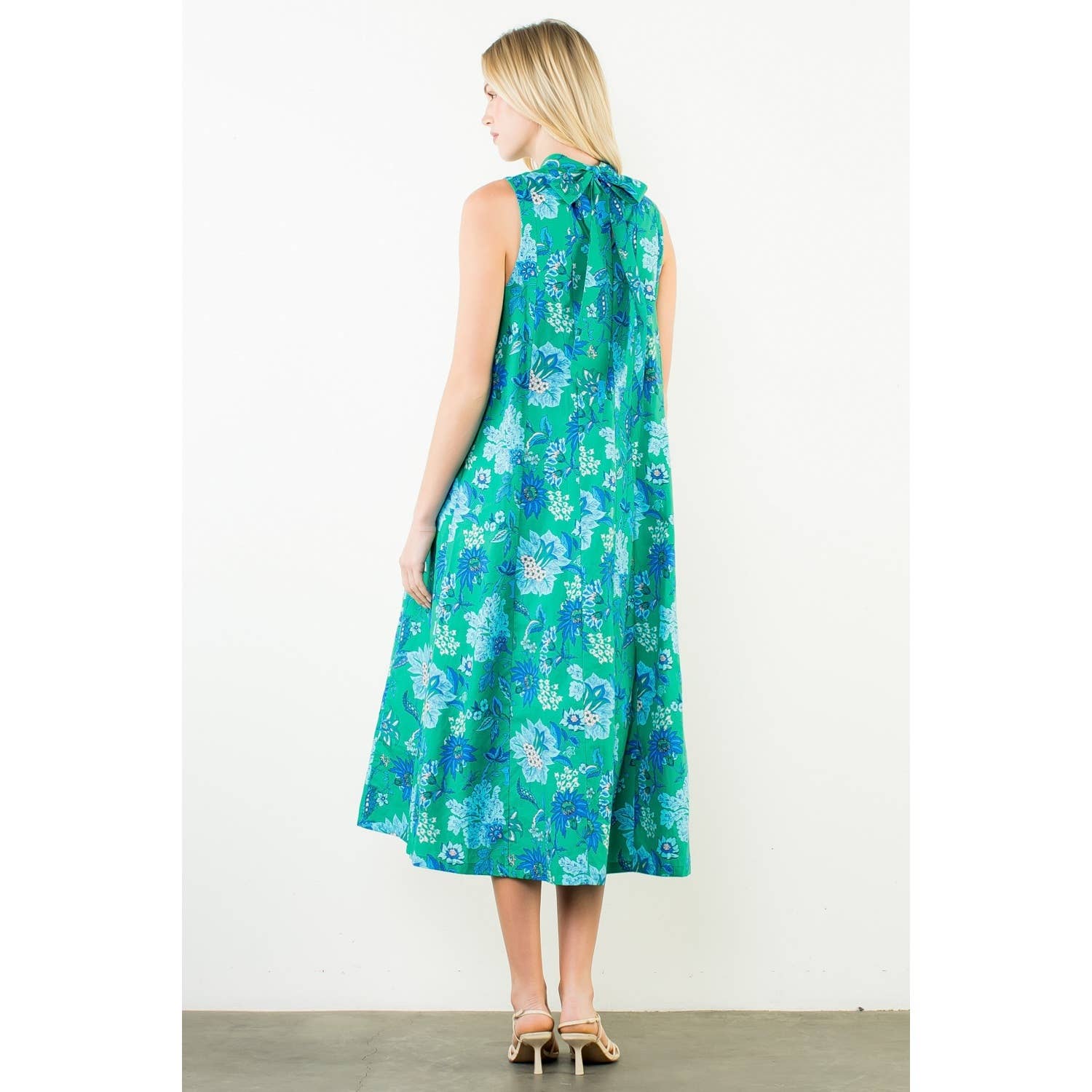This sleeveless midi features a graceful high neckline and an easy, elongated silhouette that moves beautifully with every step. The blue and beige botanical print feels fresh yet classic — equally at home at a spring luncheon, a garden party, or an early fall gathering layered with a light wrap.