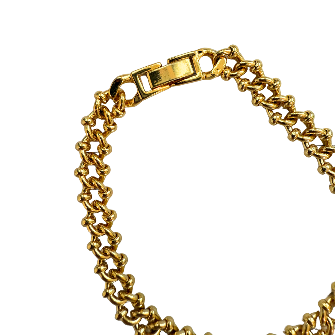 A chic nod to understated ’80s elegance. This vintage gold-tone bracelet features smooth, rounded ball links that catch the light beautifully with every movement. Simple yet striking, it’s the kind of piece that feels effortlessly polished—perfect on its own or layered into your favorite bracelet stack.