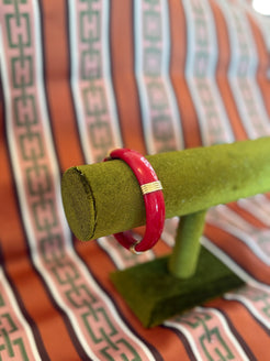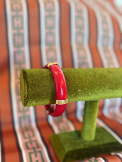 Bold, vibrant, and unmistakably retro, this 1980s lucite bangle brings instant statement style to any outfit. Crafted in a striking lipstick-red hue, the bracelet features glossy lucite paired with sleek gold-tone station accents that give it a chic, high-contrast look. Its smooth, lightweight construction makes it comfortable for everyday wear while still offering that iconic ’80s flair.