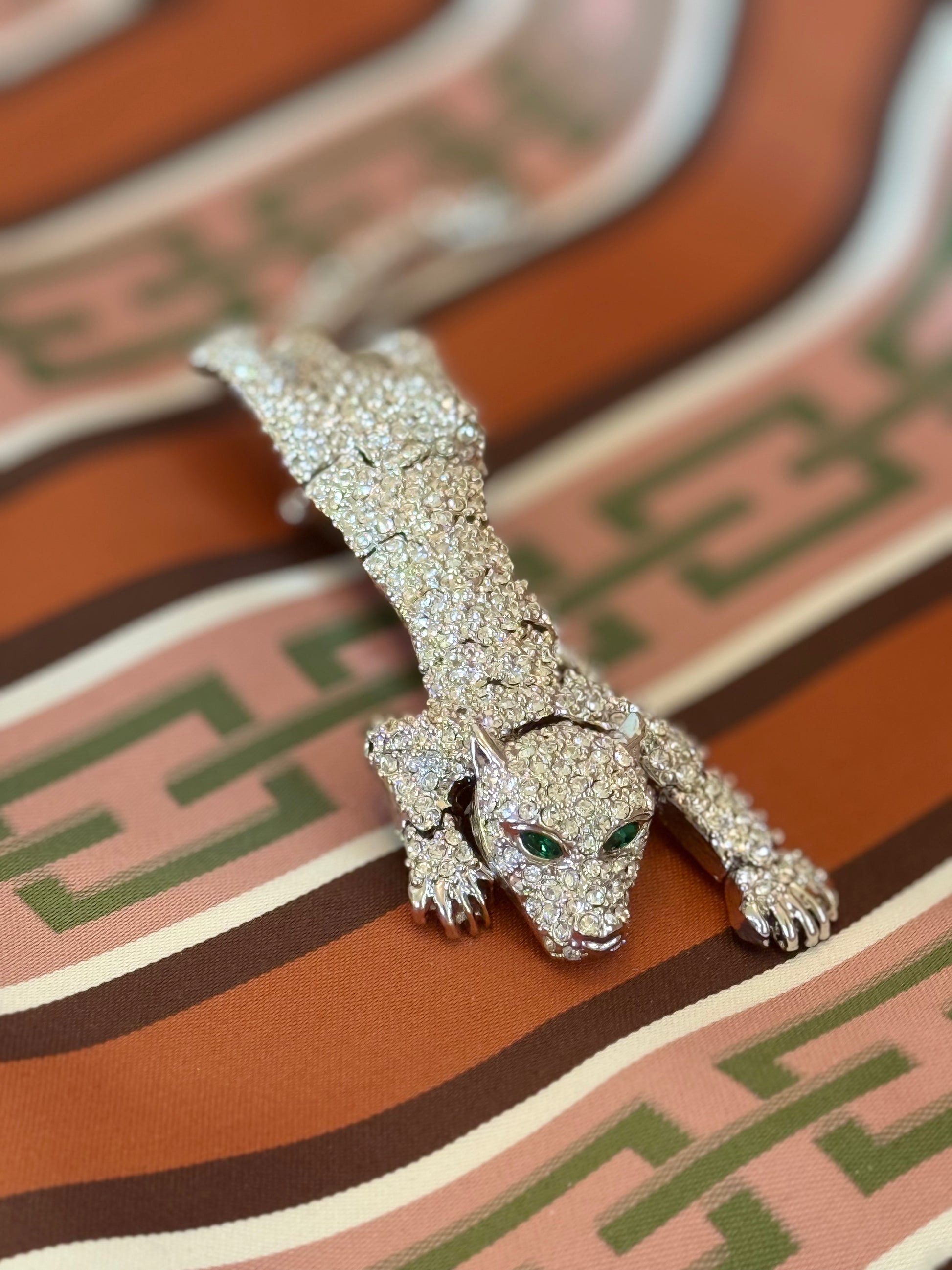 Add a touch of wild glamour to your look with this stunning Articulated Tiger Cat Brooch, fully covered in dazzling rhinestones. The articulated (jointed) body gives the piece a lifelike sense of movement, making it shimmer beautifully with every turn. Detailed metalwork captures the cat’s sleek, powerful form, while the rhinestone sparkle brings irresistible vintage-style drama.
