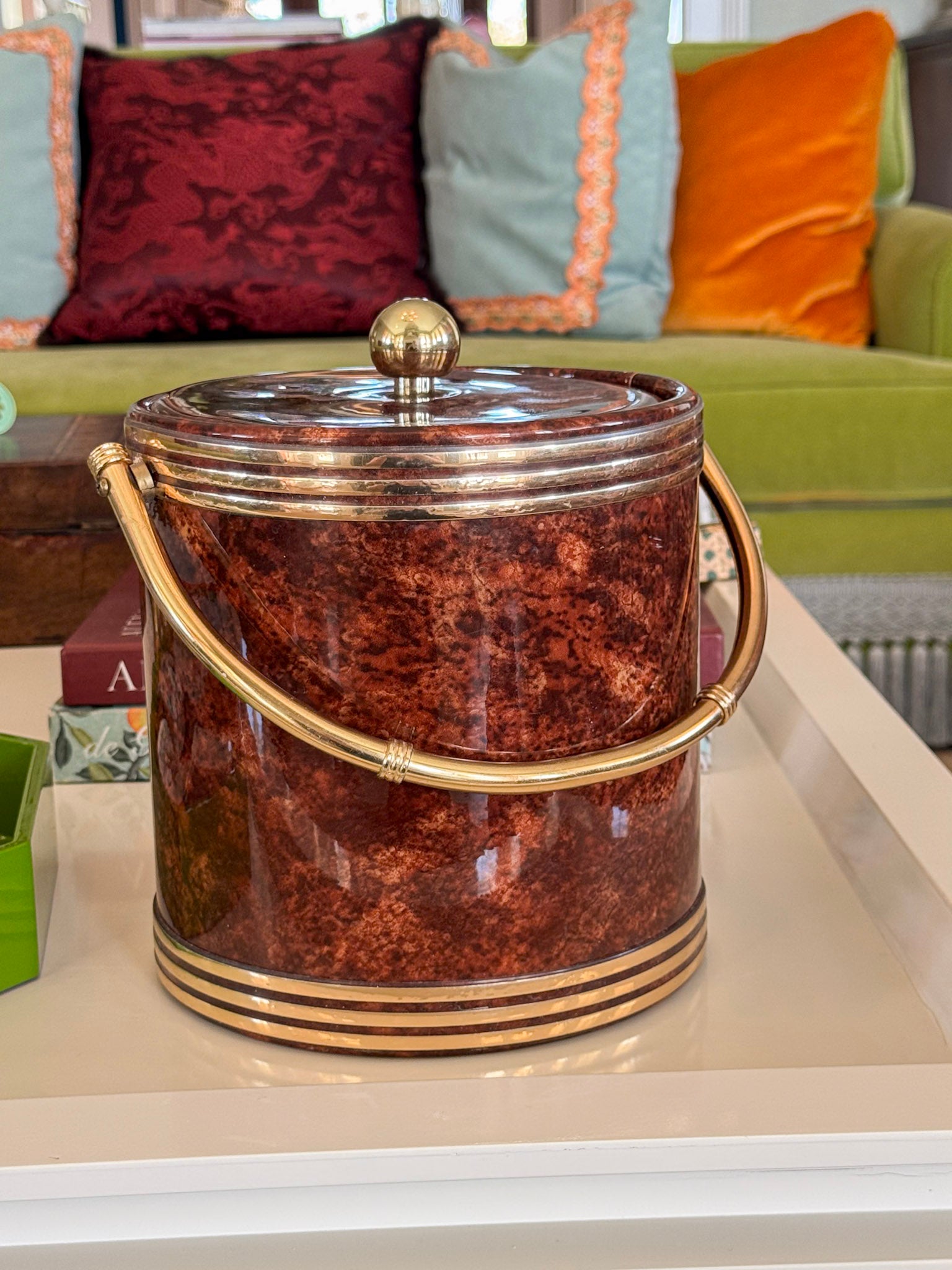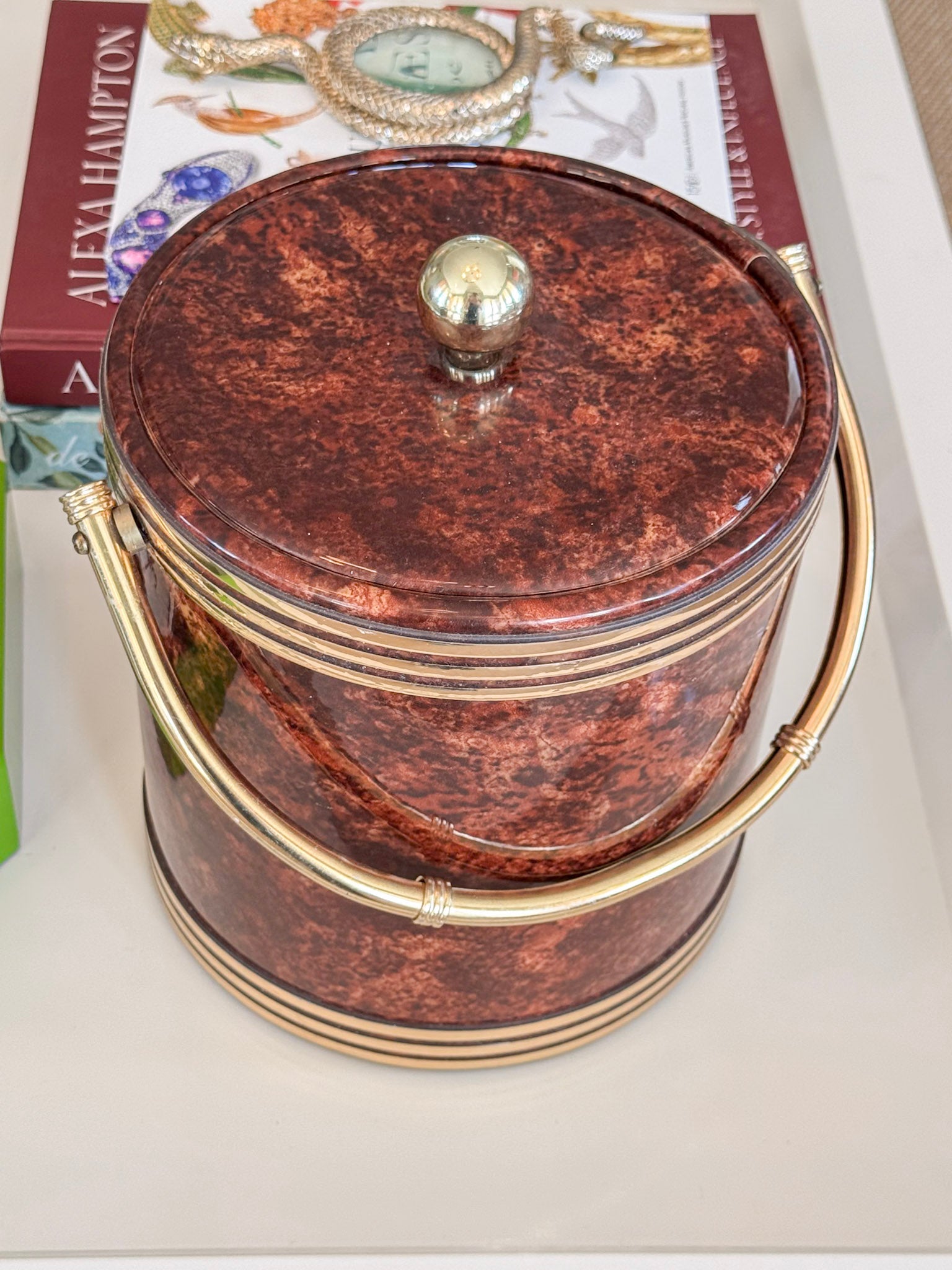 A striking vintage ice bucket in rich tortoiseshell tones, finished with polished brass banding, a swing handle, and a domed lid topped with a classic brass knob. The scale is generous and the coloring beautifully variegated, giving it that unmistakable mid-century glamour.