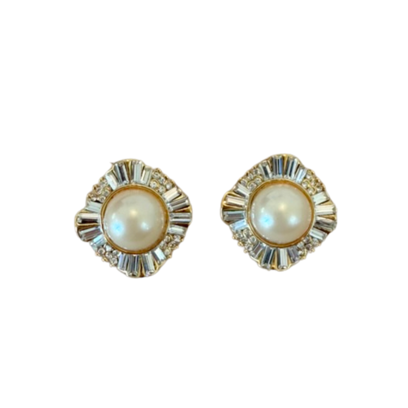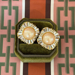 A symphony of shimmer and polish. These 1980s clip-ons combine luminous faux pearls with glimmering baguette rhinesto...