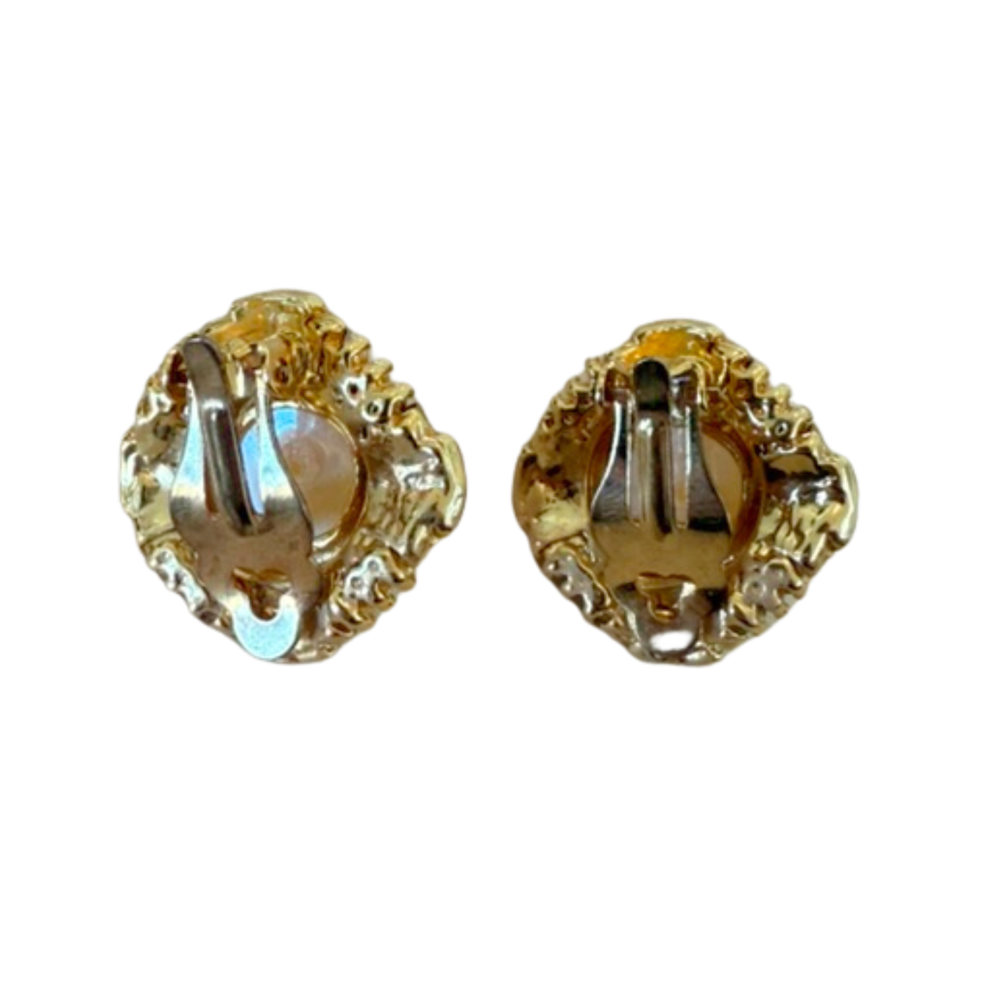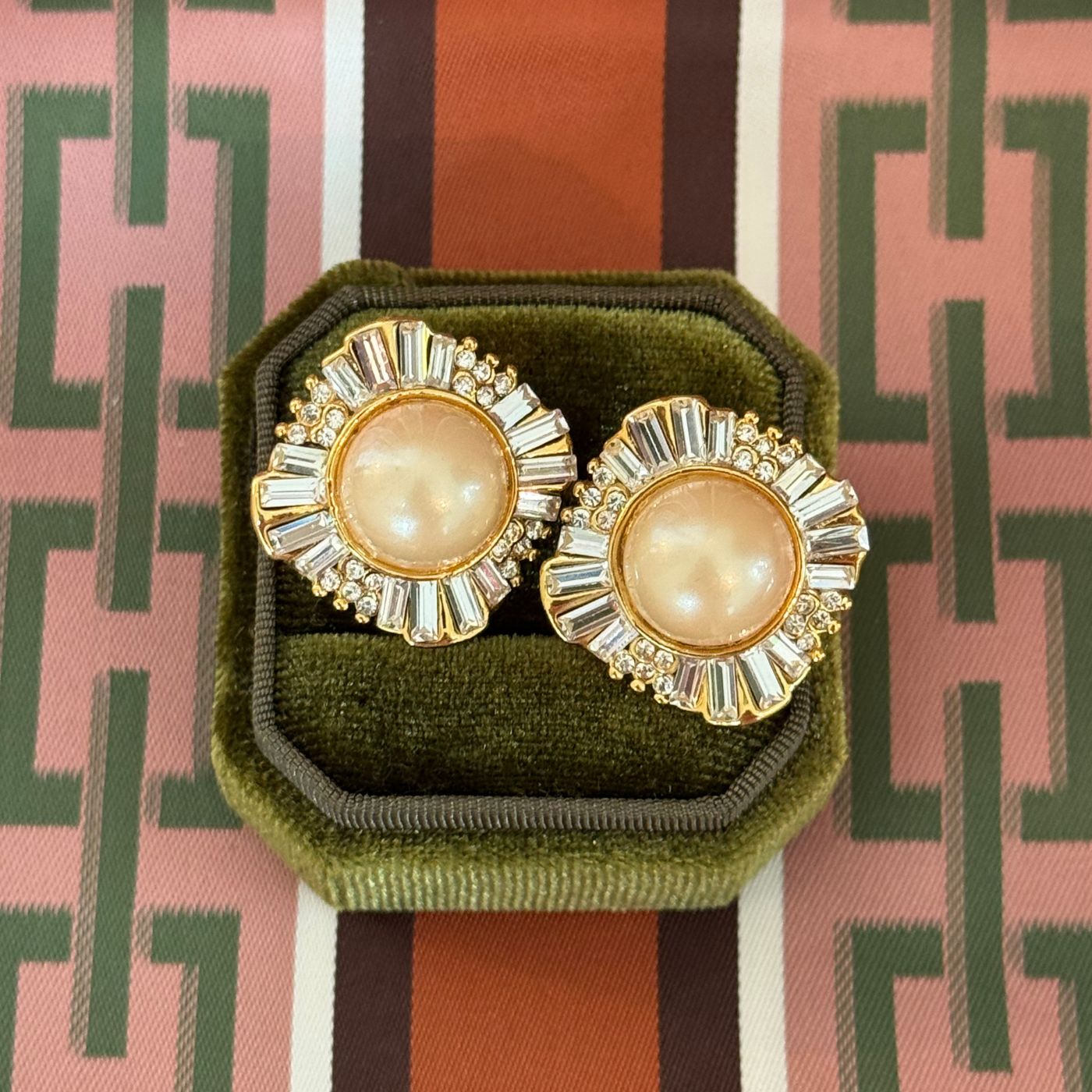A symphony of shimmer and polish. These 1980s clip-ons combine luminous faux pearls with glimmering baguette rhinestones for a look that’s both elegant and bold. Think cocktail hour meets old-Hollywood sparkle.